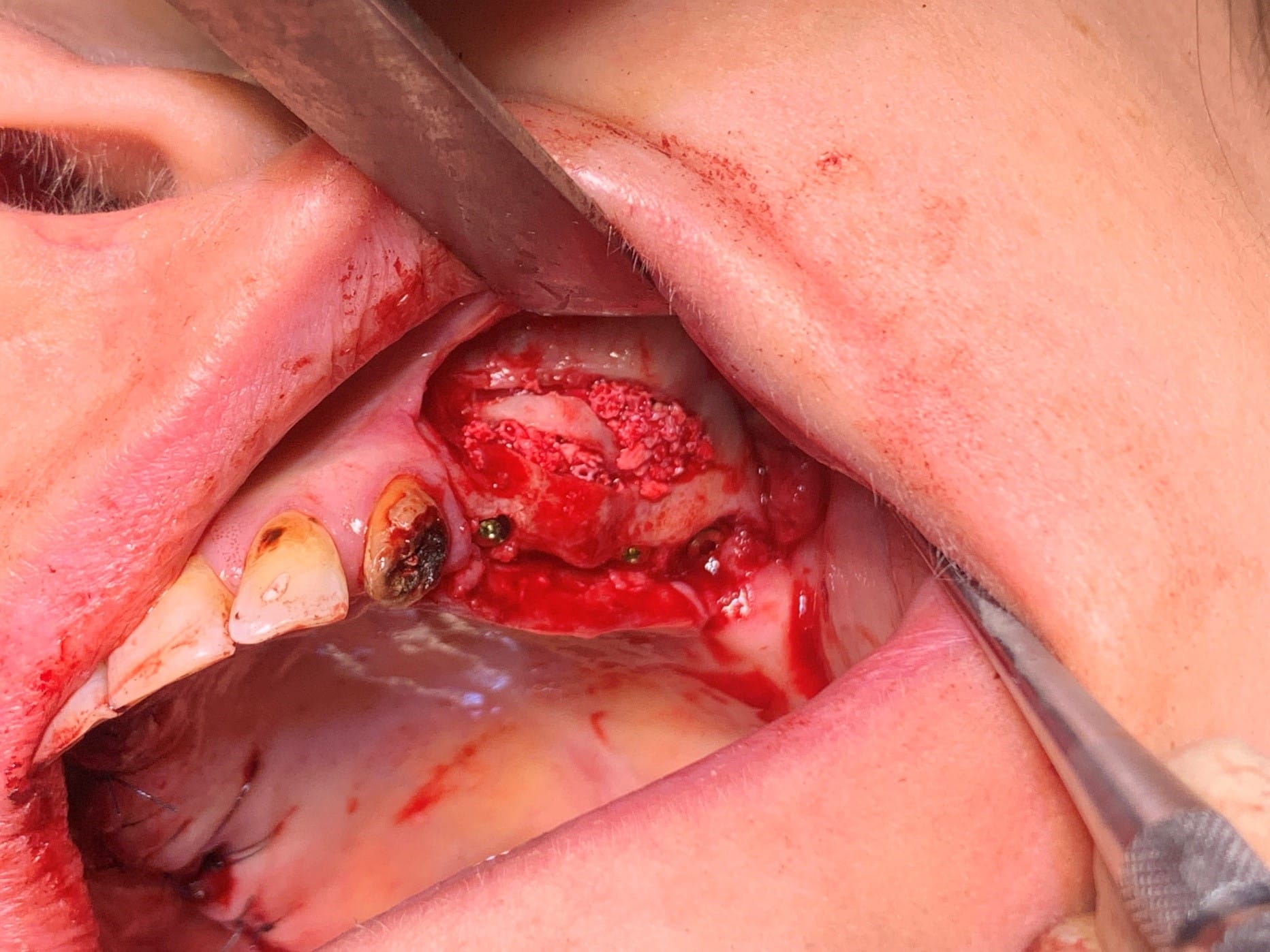 La nivelul implantului 12 s-a realizat adiție osoasă vestibulara (os bovin, os autolog 50:50 și membrană pericard fixată cu pini).