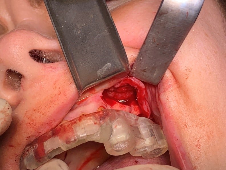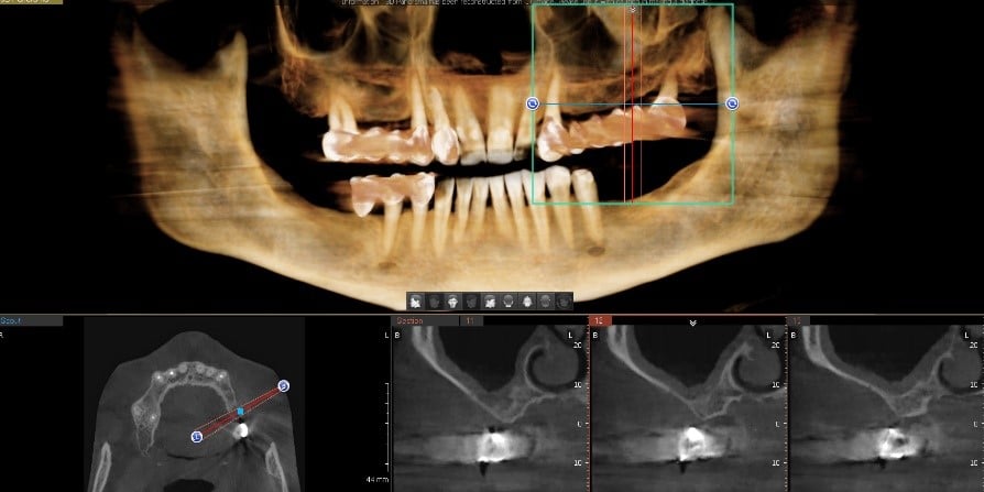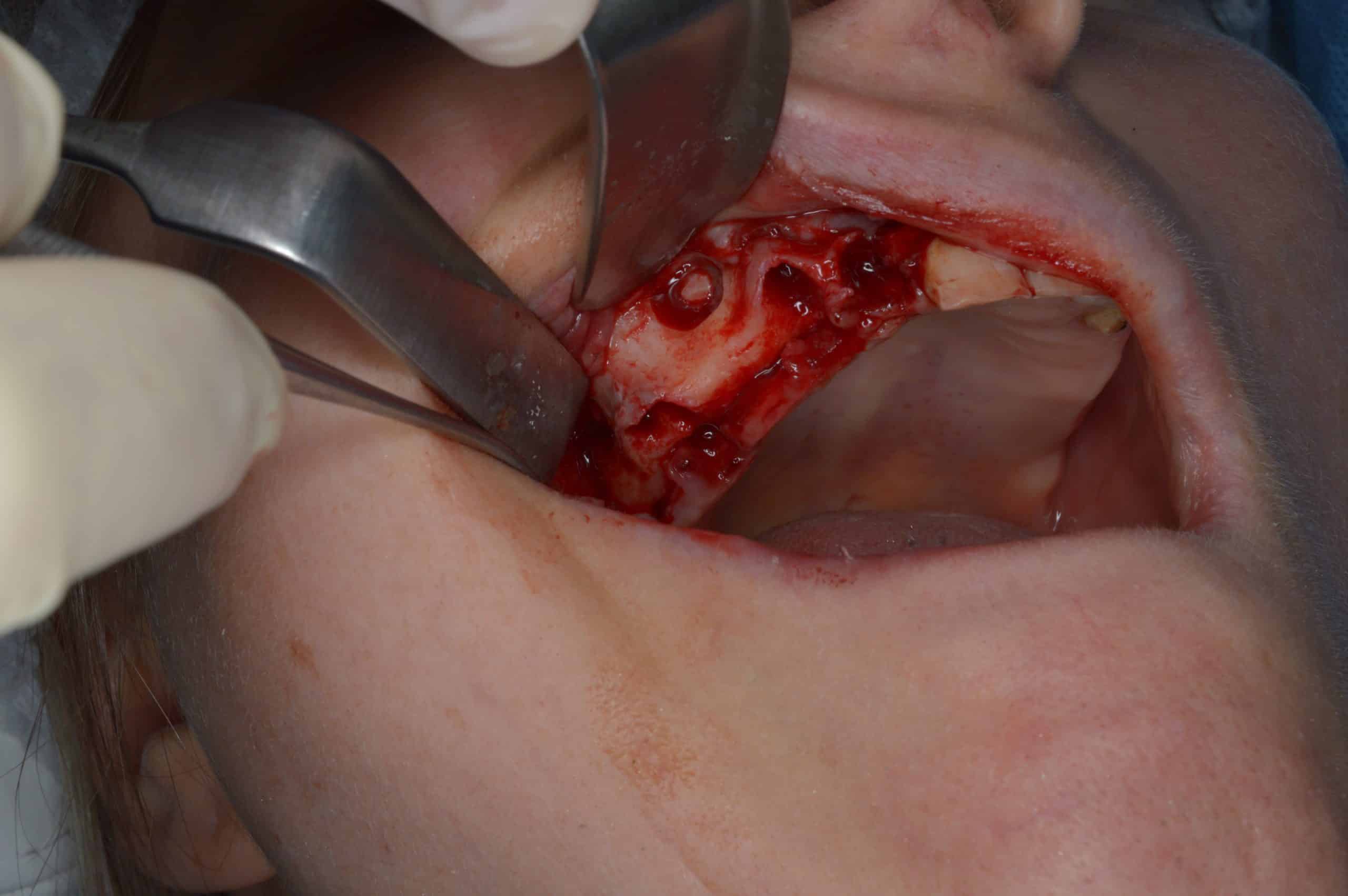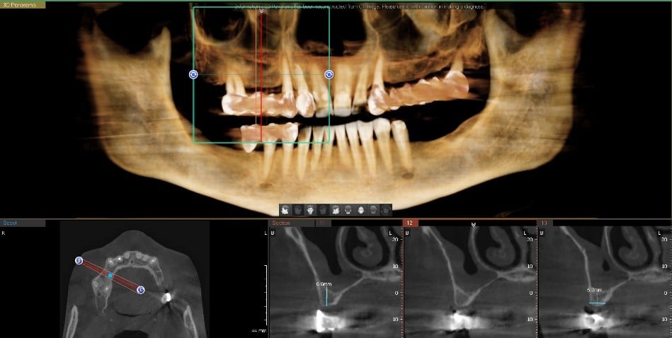 În urma evaluării CBCT-ului s-a constatat necesitatea realizării augmentarii osoase ăn zona posterioară maxilară, lifting sinusal maxilar bilateral odată cu inserarea implanturilor.