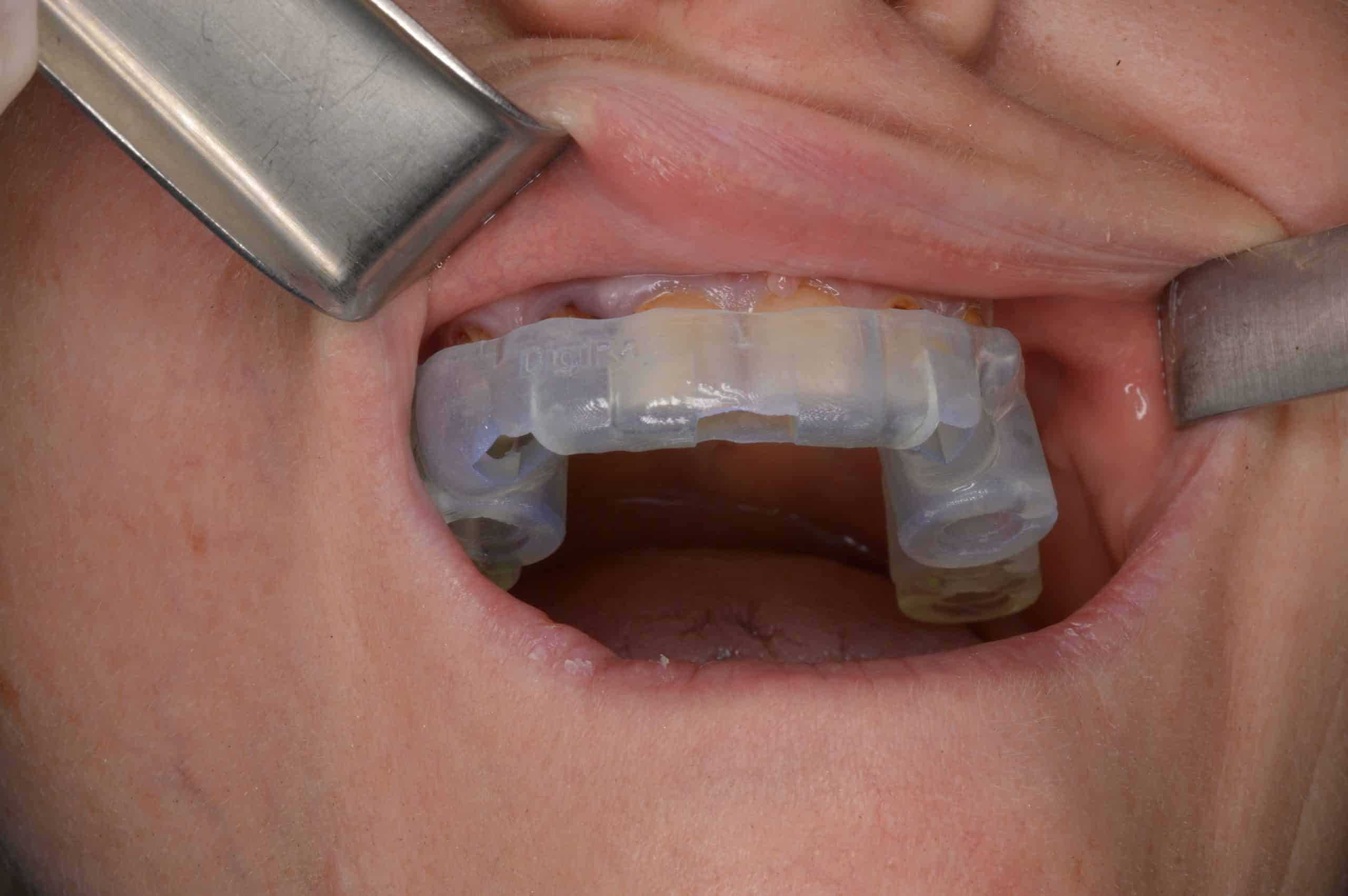 Medicul a verificat stabilitatea ghidului chirurgical pe dinți. Cu toate că extracțiile dinților 12, 13 și inserarea implantului în pozitia 12 nu au fost planificate în prealabil, ghidul chirurgical a avut stabilitate excelentă.